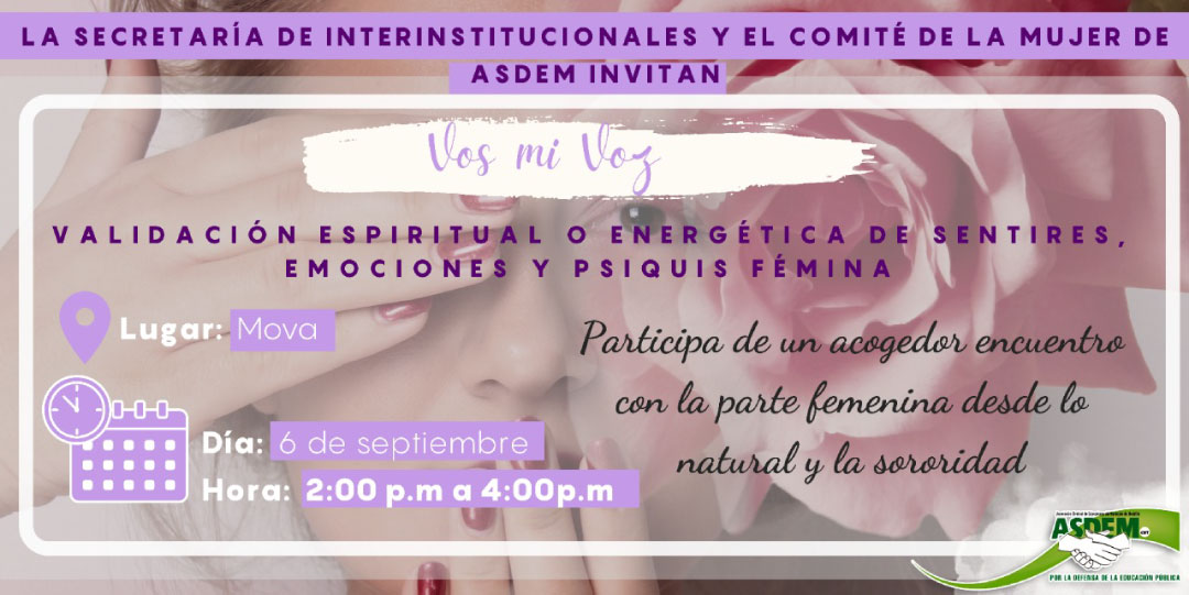La Secretaría de Interinstitucionales y el Comité de la Mujer, Género y Diversidad Sexual de ASDEM, los invitamos a participar de Vos mi Voz, un espacio para la validación espiritual o energética de sentires, emociones y psiquis fémina.
